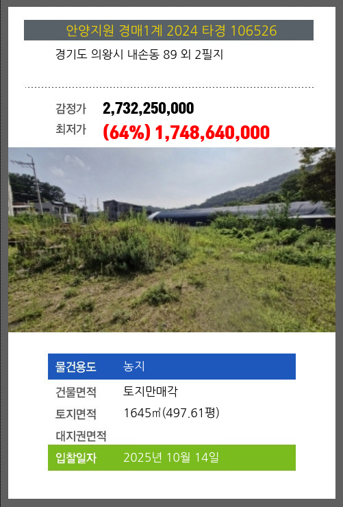 사건번호 2024 타경 106526 본건은 경기도 의왕시 내손동 89 외 2필지소재하는 농지경매 물건의 포스팅입니다. 건물면적 [ 토지만매각 ]토지면적 [ 1645㎡ (497.61평) ] 시세를 반영한 감정가