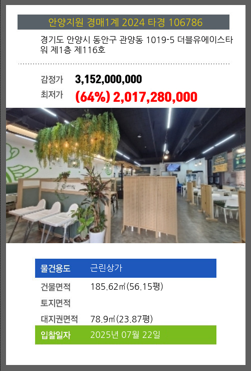 사건번호 2024 타경 106786 본건은 경기도 안양시 동안구 관양동 1019-5 더블유에이스타워 제1층 제116호소재하는 근린상가경매 물건의 포스팅입니다. 건물면적 [ 185.62㎡ (56.15평) ]대지권 [ 78.9㎡ (23.87평) ]