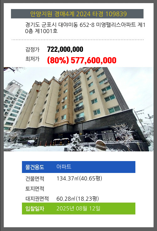 사건번호 2024 타경 109839 본건은 경기도 군포시 대야미동 652-8 미영팰리스아파트 제10층 제1001호소재하는 아파트경매 물건의 포스팅입니다. 건물면적 [ 134.37㎡ (40.65평) ]대지권 [ 60.28㎡ (18.23평) ] 시세를