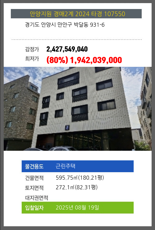 사건번호 2024 타경 107550 본건은 경기도 안양시 만안구 박달동 931-6소재하는 근린주택경매 물건의 포스팅입니다. 건물면적 [ 595.75㎡ (180.21평) ]토지면적 [ 272.1㎡ (82.31평) ] 시세를 반영한 감정가