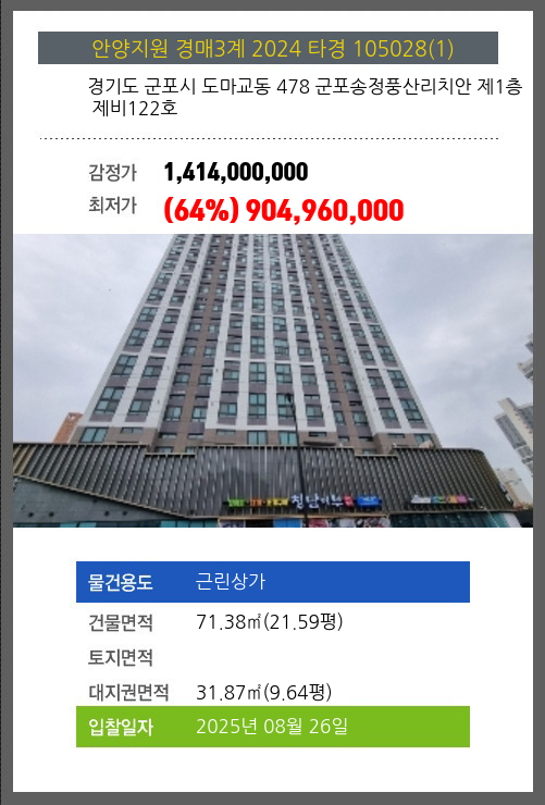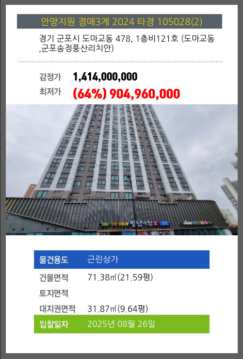 사건번호 2024 타경 105028(2) 본건은 경기 군포시 도마교동 478, 1층비121호 (도마교동,군포송정풍산리치안)소재하는 근린상가경매 물건의 포스팅입니다. 건물면적 [ 71.38㎡ (21.59평) ]대지권 [ 31.87㎡ (9.64평) ] 시세를 반영한