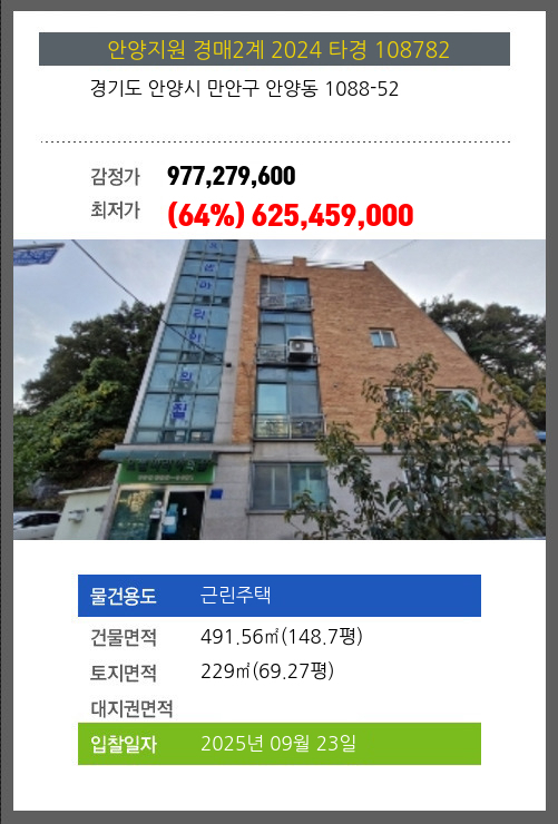 사건번호 2024 타경 108782 본건은 경기도 안양시 만안구 안양동 1088-52소재하는 근린주택경매 물건의 포스팅입니다. 건물면적 [ 491.56㎡ (148.7평) ]토지면적 [ 229㎡ (69.27평) ] 시세를 반영한 감정가