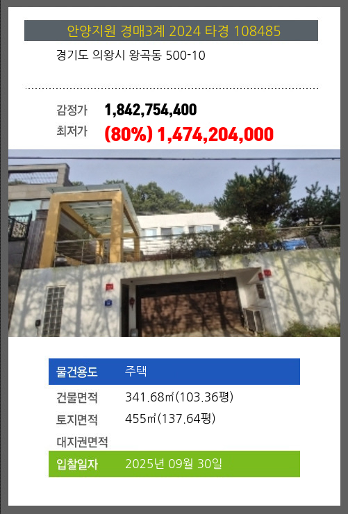 사건번호 2024 타경 108485 본건은 경기도 의왕시 왕곡동 500-10소재하는 주택경매 물건의 포스팅입니다. 건물면적 [ 341.68㎡ (103.36평) ]토지면적 [ 455㎡ (137.64평) ] 시세를 반영한 감정가 1,842,754,400에서1회