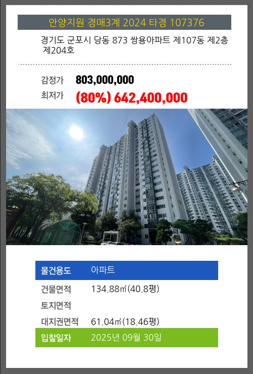 사건번호 2024 타경 107376 본건은 경기도 군포시 당동 873 쌍용아파트 제107동 제2층 제204호소재하는 아파트경매 물건의 포스팅입니다. 건물면적 [ 134.88㎡ (40.8평) ]대지권 [ 61.04㎡ (18.46평) ]