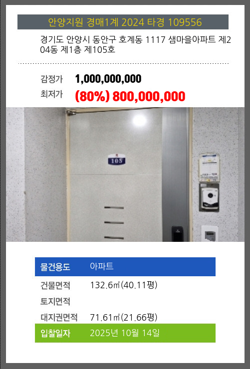 사건번호 2024 타경 109556 본건은 경기도 안양시 동안구 호계동 1117 샘마을아파트 제204동 제1층 제105호소재하는 아파트경매 물건의 포스팅입니다. 건물면적 [ 132.6㎡ (40.11평) ]대지권 [ 71.61㎡ (21.66평)