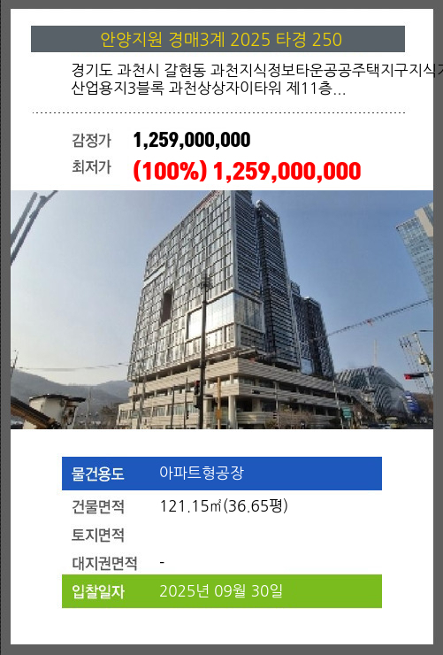 사건번호 2025 타경 250 본건은 경기도 과천시 갈현동 과천지식정보타운공공주택지구지식기반산업용지3블록 과천상상자이타워 제11층…소재하는 아파트형공장경매 물건의 포스팅입니다. 건물면적 [ 121.15㎡ (36.65평) ] 시세를 반영한 감정가 1,259,000,000에서신건으로 감정가 대비