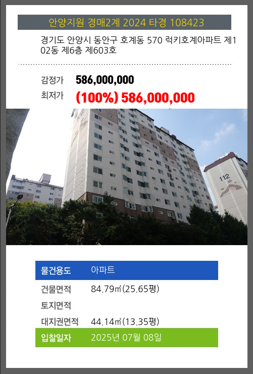 사건번호 2024 타경 108423 본건은 경기도 안양시 동안구 호계동 570 럭키호계아파트 제102동 제6층 제603호소재하는 아파트경매 물건의 포스팅입니다. 건물면적 [ 84.79㎡ (25.65평) ]대지권 [ 44.14㎡ (13.35평)