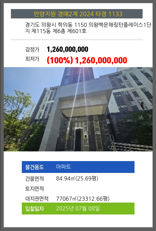 사건번호 2024 타경 1133 본건은 경기도 의왕시 학의동 1150 의왕백운해링턴플레이스1단지 제115동 제6층 제601호소재하는 아파트경매 물건의 포스팅입니다. 건물면적 [ 84.94㎡ (25.69평) ]대지권 [ 77067㎡ (23312.66평) ]