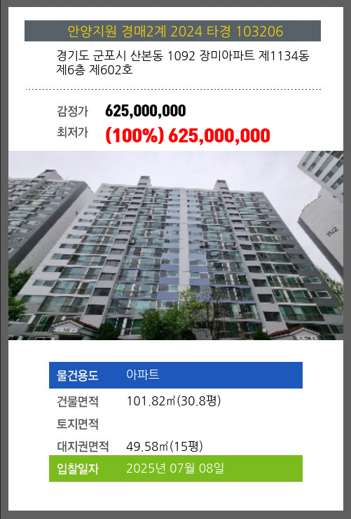 사건번호 2024 타경 103206 본건은 경기도 군포시 산본동 1092 장미아파트 제1134동 제6층 제602호소재하는 아파트경매 물건의 포스팅입니다. 건물면적 [ 101.82㎡ (30.8평) ]대지권 [ 49.58㎡ (15평) ]