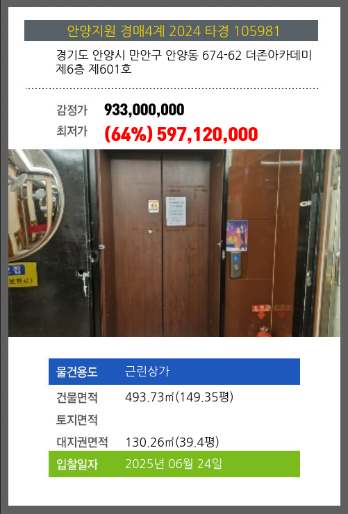 사건번호 2024 타경 105981 본건은 경기도 안양시 만안구 안양동 674-62 더존아카데미 제6층 제601호소재하는 근린상가경매 물건의 포스팅입니다. 건물면적 [ 493.73㎡ (149.35평) ]대지권 [ 130.26㎡ (39.4평) ]
