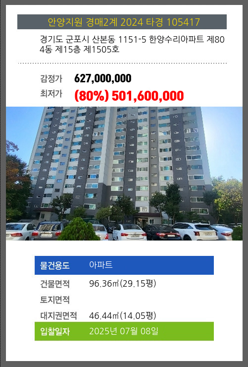 사건번호 2024 타경 105417 본건은 경기도 군포시 산본동 1151-5 한양수리아파트 제804동 제15층 제1505호소재하는 아파트경매 물건의 포스팅입니다. 건물면적 [ 96.36㎡ (29.15평) ]대지권 [ 46.44㎡ (14.05평) ]