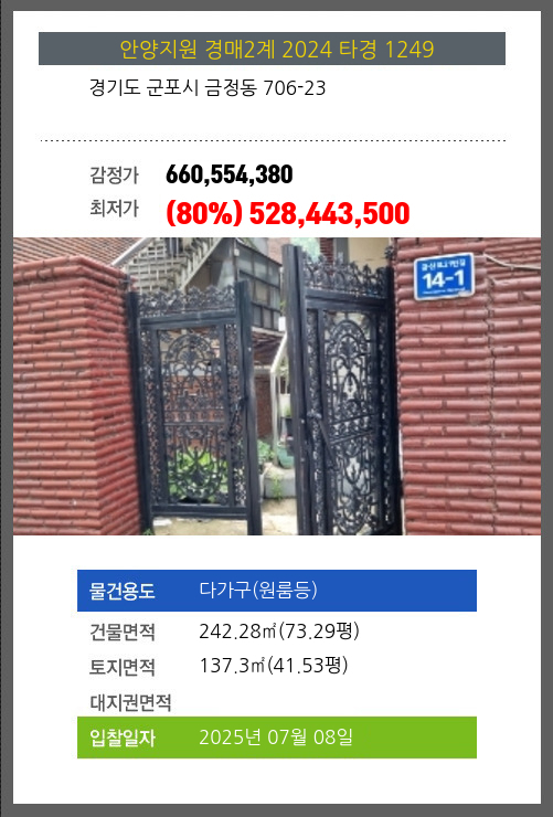 사건번호 2024 타경 1249 본건은 경기도 군포시 금정동 706-23소재하는 다가구(원룸등)경매 물건의 포스팅입니다. 건물면적 [ 242.28㎡ (73.29평) ]토지면적 [ 137.3㎡ (41.53평) ] 시세를 반영한 감정가 660,554,380에서1회