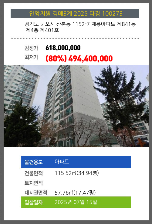 사건번호 2025 타경 100273 본건은 경기도 군포시 산본동 1152-7 계룡아파트 제841동 제4층 제401호소재하는 아파트경매 물건의 포스팅입니다. 건물면적 [ 115.52㎡ (34.94평) ]대지권 [ 57.76㎡ (17.47평) ]