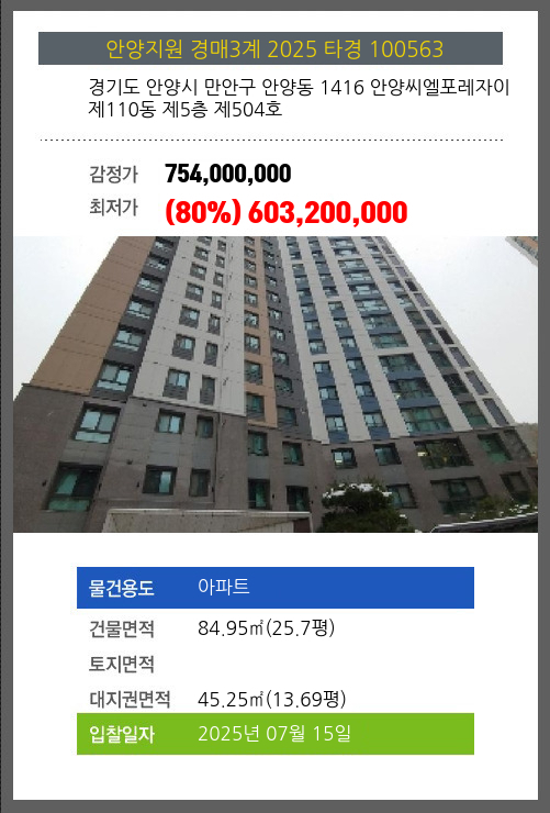 사건번호 2025 타경 100563 본건은 경기도 안양시 만안구 안양동 1416 안양씨엘포레자이 제110동 제5층 제504호소재하는 아파트경매 물건의 포스팅입니다. 건물면적 [ 84.95㎡ (25.7평) ]대지권 [ 45.25㎡ (13.69평)