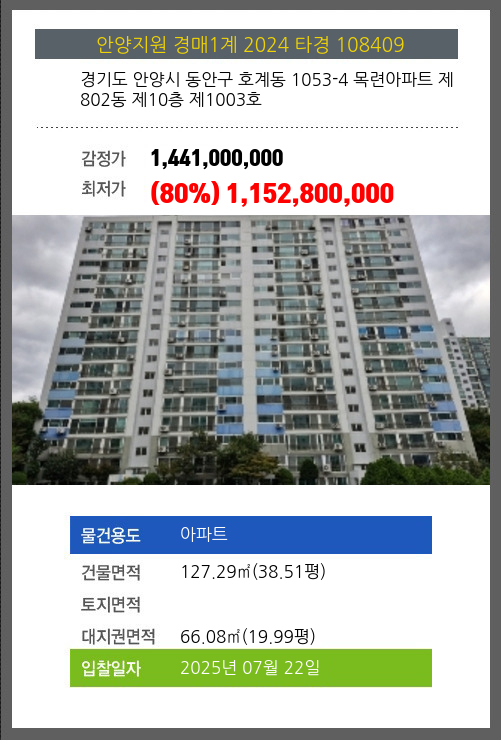 사건번호 2024 타경 108409 본건은 경기도 안양시 동안구 호계동 1053-4 목련아파트 제802동 제10층 제1003호소재하는 아파트경매 물건의 포스팅입니다. 건물면적 [ 127.29㎡ (38.51평) ]대지권 [ 66.08㎡ (19.99평)