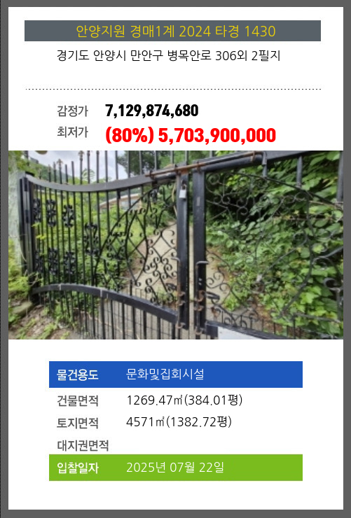 사건번호 2024 타경 1430 본건은 경기도 안양시 만안구 병목안로 306외 2필지소재하는 문화및집회시설경매 물건의 포스팅입니다. 건물면적 [ 1269.47㎡ (384.01평) ]토지면적 [ 4571㎡ (1382.72평) ] 시세를 반영한