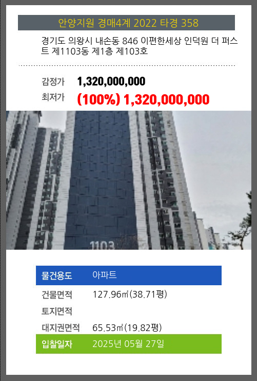 사건번호 2022 타경 358 본건은 경기도 의왕시 내손동 846 이편한세상 인덕원 더 퍼스트 제1103동 제1층 제103호소재하는 아파트경매 물건의 포스팅입니다. 건물면적 [ 127.96㎡ (38.71평) ]대지권 [