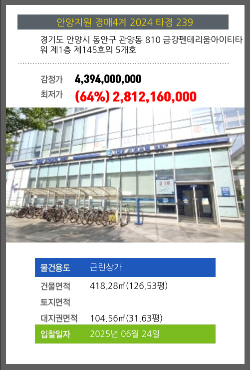 사건번호 2024 타경 239 본건은 경기도 안양시 동안구 관양동 810 금강펜테리움아이티타워 제1층 제145호외 5개호소재하는 근린상가경매 물건의 포스팅입니다. 건물면적 [ 418.28㎡ (126.53평) ]대지권 [ 104.56㎡ (31.63평)