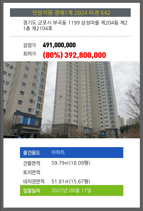 사건번호 2024 타경 642 본건은 경기도 군포시 부곡동 1199 삼성마을 제204동 제21층 제2104호소재하는 아파트경매 물건의 포스팅입니다. 건물면적 [ 59.79㎡ (18.09평) ]대지권 [ 51.81㎡ (15.67평) ]