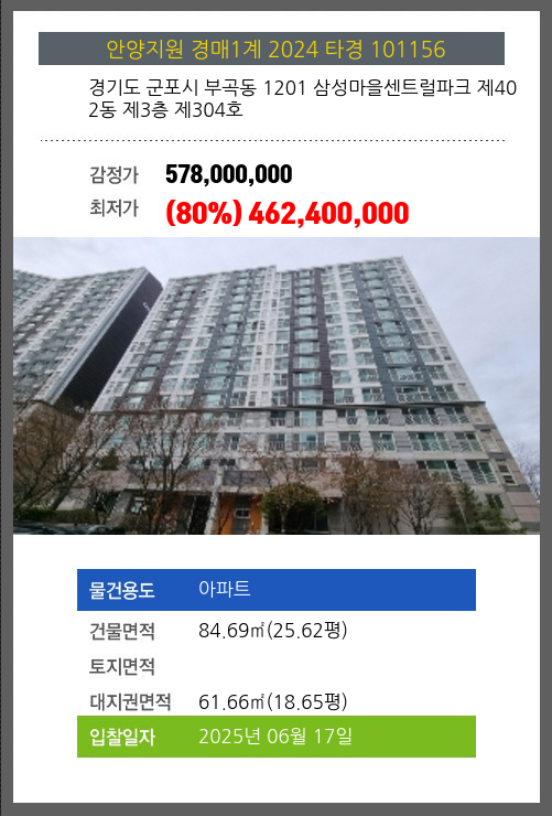 사건번호 2024 타경 101156 본건은 경기도 군포시 부곡동 1201 삼성마을센트럴파크 제402동 제3층 제304호소재하는 아파트경매 물건의 포스팅입니다. 건물면적 [ 84.69㎡ (25.62평) ]대지권 [ 61.66㎡ (18.65평) ]