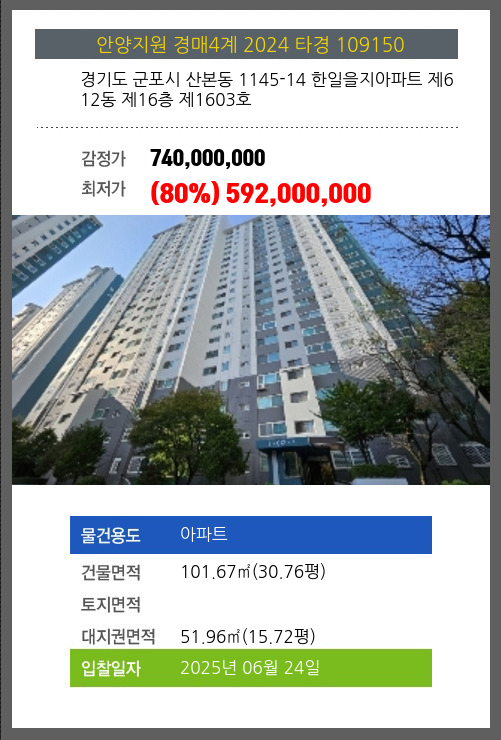 사건번호 2024 타경 109150 본건은 경기도 군포시 산본동 1145-14 한일을지아파트 제612동 제16층 제1603호소재하는 아파트경매 물건의 포스팅입니다. 건물면적 [ 101.67㎡ (30.76평) ]대지권 [ 51.96㎡ (15.72평) ]