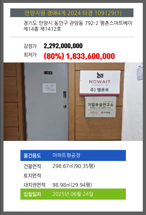 사건번호 2024 타경 109129(1) 본건은 경기도 안양시 동안구 관양동 792-2 평촌스마트베이 제14층 제1412호소재하는 아파트형공장경매 물건의 포스팅입니다. 건물면적 [ 298.67㎡ (90.35평) ]대지권 [ 98.98㎡ (29.94평) ]