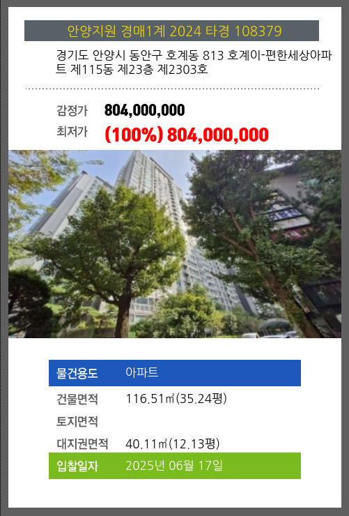 사건번호 2024 타경 108379 본건은 경기도 안양시 동안구 호계동 813 호계이-편한세상아파트 제115동 제23층 제2303호소재하는 아파트경매 물건의 포스팅입니다. 건물면적 [ 116.51㎡ (35.24평) ]대지권 [ 40.11㎡ (12.13평)