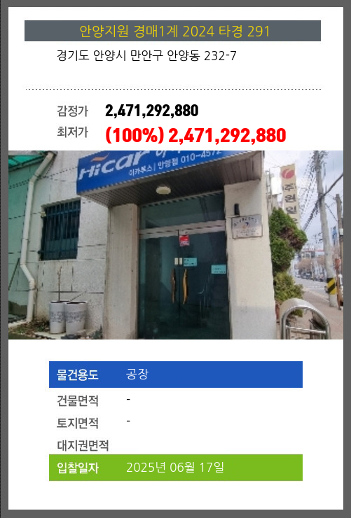 사건번호 2024 타경 291 본건은 경기도 안양시 만안구 안양동 232-7소재하는 공장경매 물건의 포스팅입니다. 건물면적 [ 415.67㎡ (125.74평) ]토지면적 [ 471㎡ (142.48평) ] 시세를 반영한 감정가