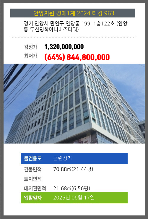 사건번호 2024 타경 963 본건은 경기 안양시 만안구 안양동 199, 1층122호 (안양동,두산명학아너비즈타워)소재하는 근린상가경매 물건의 포스팅입니다. 건물면적 [ 70.88㎡ (21.44평) ]대지권 [ 21.68㎡ (6.56평) ] 시세를