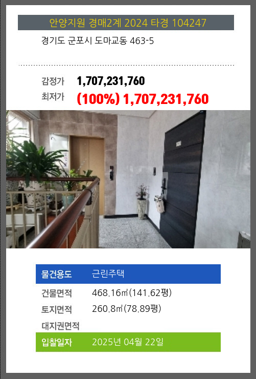 사건번호 2024 타경 104247 본건은 경기도 군포시 도마교동 463-5소재하는 근린주택경매 물건의 포스팅입니다. 건물면적 [ 468.16㎡ (141.62평) ]토지면적 [ 260.8㎡ (78.89평) ] 시세를 반영한 감정가 1,707,231,760에서신건으로