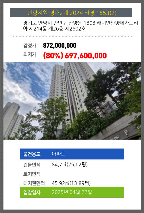 사건번호 2024 타경 1553(2) 본건은 경기도 안양시 만안구 안양동 1393 래미안안양메가트리아 제214동 제26층 제2602호소재하는 아파트경매 물건의 포스팅입니다. 건물면적 [ 84.7㎡ (25.62평) ]대지권 [ 45.92㎡ (13.89평)