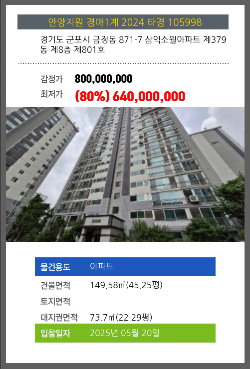 사건번호 2024 타경 105998 본건은 경기도 군포시 금정동 871-7 삼익소월아파트 제379동 제8층 제801호소재하는 아파트경매 물건의 포스팅입니다. 건물면적 [ 149.58㎡ (45.25평) ]대지권 [ 73.7㎡ (22.29평) ]