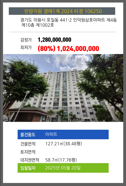 사건번호 2024 타경 106250 본건은 경기도 의왕시 포일동 441-2 인덕원삼호아파트 제4동 제10층 제1002호소재하는 아파트경매 물건의 포스팅입니다. 건물면적 [ 127.21㎡ (38.48평) ]대지권 [ 58.7㎡ (17.76평) ]