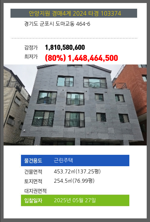 사건번호 2024 타경 103374 본건은 경기도 군포시 도마교동 464-6소재하는 근린주택경매 물건의 포스팅입니다. 건물면적 [ 453.72㎡ (137.25평) ]토지면적 [ 254.5㎡ (76.99평) ] 시세를 반영한 감정가 1,810,580,600에서1회