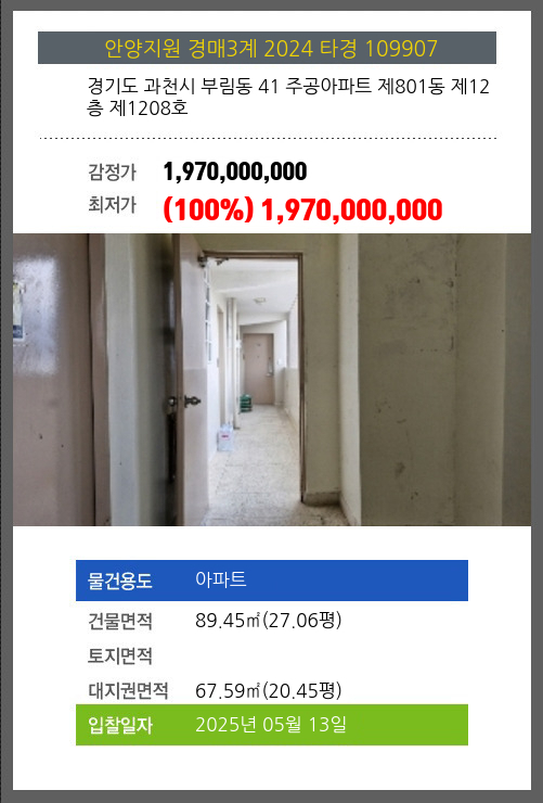 사건번호 2024 타경 109907 본건은 경기도 과천시 부림동 41 주공아파트 제801동 제12층 제1208호소재하는 아파트경매 물건의 포스팅입니다. 건물면적 [ 89.45㎡ (27.06평) ]대지권 [ 67.59㎡ (20.45평) ]