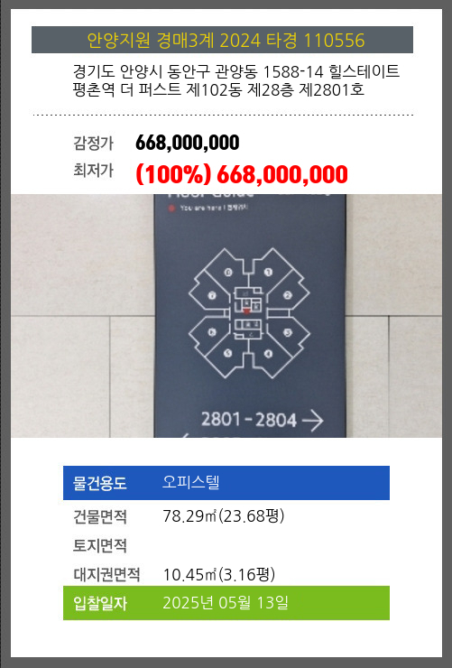 사건번호 2024 타경 110556 본건은 경기도 안양시 동안구 관양동 1588-14 힐스테이트 평촌역 더 퍼스트 제102동 제28층 제2801호소재하는 오피스텔경매 물건의 포스팅입니다. 건물면적 [ 78.29㎡ (23.68평) ]대지권