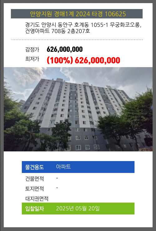 사건번호 2024 타경 106625 본건은 경기도 안양시 동안구 호계동 1055-1 무궁화코오롱,건영아파트 708동 2층207호소재하는 아파트경매 물건의 포스팅입니다. 시세를 반영한 감정가 626,000,000에서신건으로 감정가 대비 100%최저가 626,000,000부터입찰에 참여할