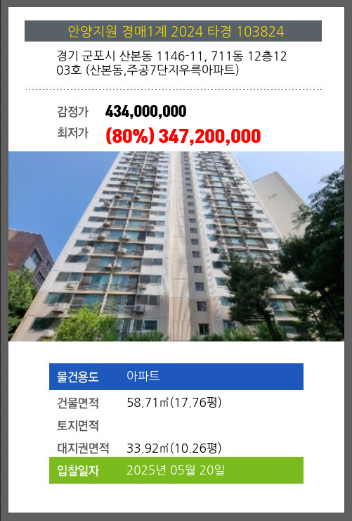 사건번호 2024 타경 103824 본건은 경기 군포시 산본동 1146-11, 711동 12층1203호 (산본동,주공7단지우륵아파트)소재하는 아파트경매 물건의 포스팅입니다. 건물면적 [ 58.71㎡ (17.76평) ]대지권 [ 33.92㎡ (10.26평) ] 시세를