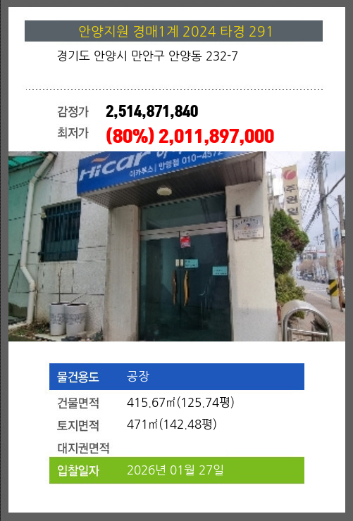 사건번호 2024 타경 291 본건은 경기도 안양시 만안구 안양동 232-7소재하는 공장경매 물건의 포스팅입니다. 건물면적 [ 415.67㎡ (125.74평) ]토지면적 [ 471㎡ (142.48평) ] 시세를 반영한 감정가