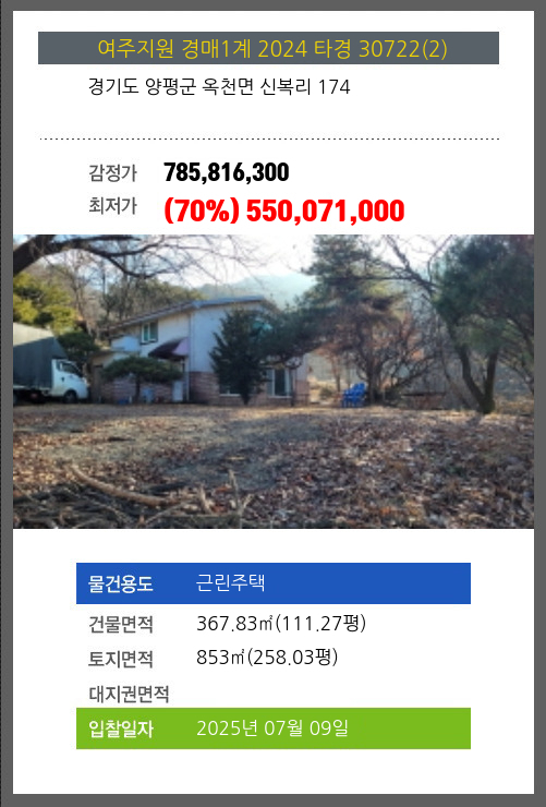 사건번호 2024 타경 30722(2) 본건은 경기도 양평군 옥천면 신복리 174소재하는 근린주택경매 물건의 포스팅입니다. 건물면적 [ 367.83㎡ (111.27평) ]토지면적 [ 853㎡ (258.03평) ] 시세를 반영한 감정가