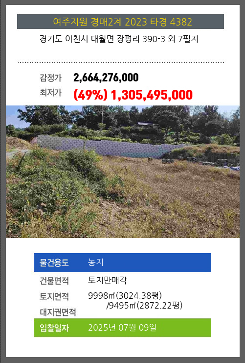 사건번호 2023 타경 4382 본건은 경기도 이천시 대월면 장평리 390-3 외 7필지소재하는 농지경매 물건의 포스팅입니다. 건물면적 [ 토지만매각 ]토지면적 [ 전체:9998㎡ (3024.38평) 매각지분:9495㎡ (2872.22평) ]