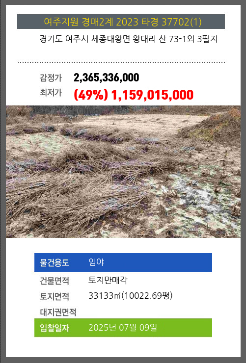 사건번호 2023 타경 37702(1) 본건은 경기도 여주시 세종대왕면 왕대리 산 73-1외 3필지소재하는 임야경매 물건의 포스팅입니다. 건물면적 [ 토지만매각 ]토지면적 [ 33133㎡ (10022.69평) ] 시세를 반영한