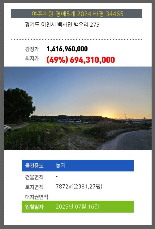 사건번호 2024 타경 34465 본건은 경기도 이천시 백사면 백우리 273소재하는 농지경매 물건의 포스팅입니다. 토지면적 [ 7872㎡ (2381.27평) ] 시세를 반영한 감정가 1,416,960,000에서2회 유찰되어 감정가 대비