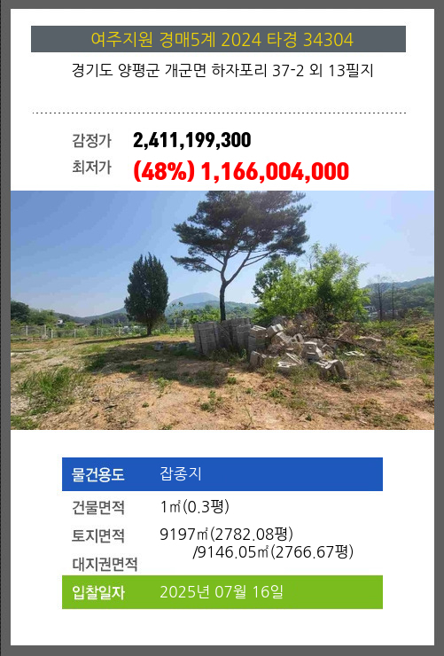 사건번호 2024 타경 34304 본건은 경기도 양평군 개군면 하자포리 37-2 외 13필지소재하는 잡종지경매 물건의 포스팅입니다. 건물면적 [ 1㎡ (0.3평) ]토지면적 [ 전체:9197㎡ (2782.08평) 매각지분:9146.05㎡ (2766.67평)