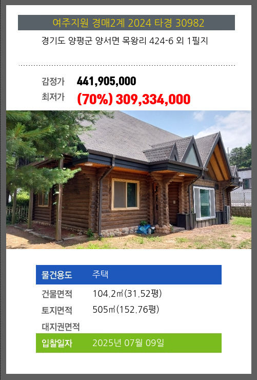 사건번호 2024 타경 30982 본건은 경기도 양평군 양서면 목왕리 424-6 외 1필지소재하는 주택경매 물건의 포스팅입니다. 건물면적 [ 104.2㎡ (31.52평) ]토지면적 [ 505㎡ (152.76평) ] 시세를