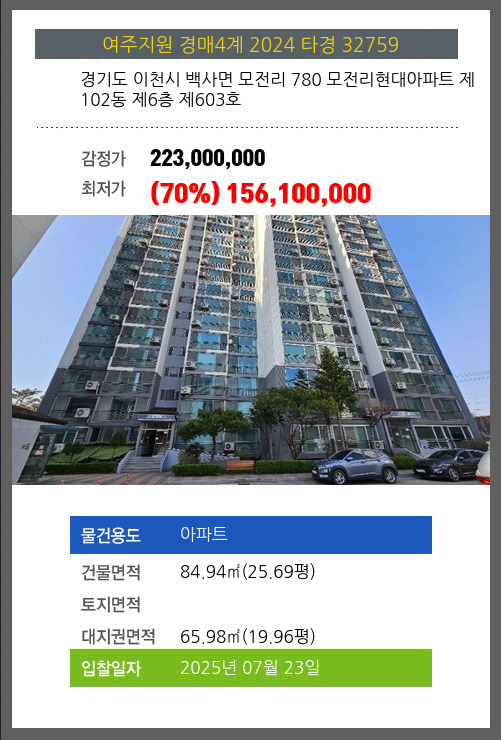 사건번호 2024 타경 32759 본건은 경기도 이천시 백사면 모전리 780 모전리현대아파트 제102동 제6층 제603호소재하는 아파트경매 물건의 포스팅입니다. 건물면적 [ 84.94㎡ (25.69평) ]대지권 [ 65.98㎡ (19.96평)