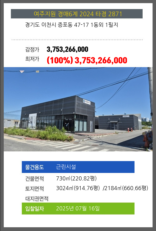 사건번호 2024 타경 2871 본건은 경기도 이천시 증포동 47-17 1동외 1필지소재하는 근린시설경매 물건의 포스팅입니다. 건물면적 [ 730㎡ (220.82평) ]토지면적 [ 전체:3024㎡ (914.76평) 매각지분:2184㎡ (660.66평) ]