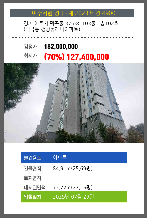 사건번호 2023 타경 4900 본건은 경기 여주시 멱곡동 376-8, 103동 1층102호 (멱곡동,정광휴레나아파트)소재하는 아파트경매 물건의 포스팅입니다. 건물면적 [ 84.91㎡ (25.69평) ]대지권 [ 73.22㎡ (22.15평) ] 시세를