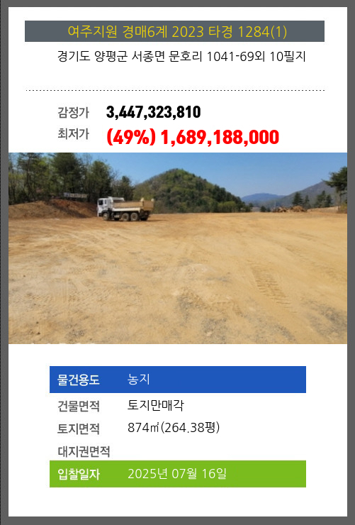 사건번호 2023 타경 1284(1) 본건은 경기도 양평군 서종면 문호리 1041-69외 10필지소재하는 농지경매 물건의 포스팅입니다. 건물면적 [ 토지만매각 ]토지면적 [ 874㎡ (264.38평) ] 시세를 반영한 감정가