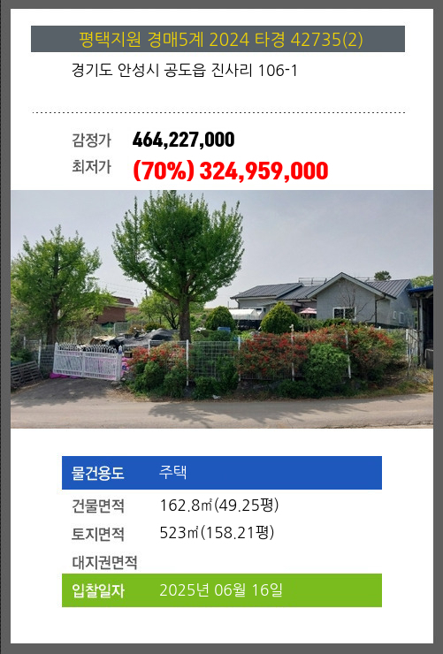 사건번호 2024 타경 42735(2) 본건은 경기도 안성시 공도읍 진사리 106-1소재하는 주택경매 물건의 포스팅입니다. 건물면적 [ 162.8㎡ (49.25평) ]토지면적 [ 523㎡ (158.21평) ] 시세를 반영한 감정가